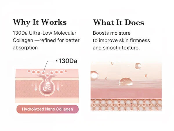 Formulated with 130Da ultra-low molecular collagen, this serum penetrates deeper for maximum absorption. It boosts elasticity, improves firmness, and smooths texture from within. Scientifically refined nano-collagen ensures your skin gets the nourishment it needs for youthful radiance and long-lasting hydration with consistent use.
